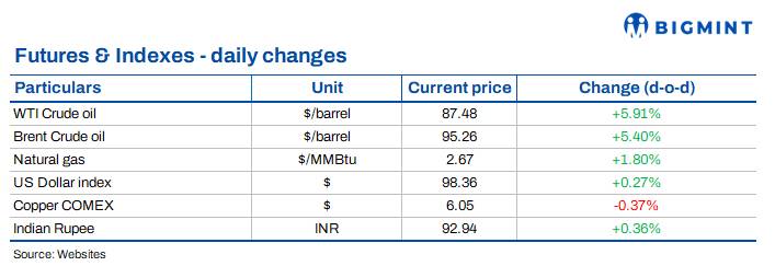 In contrast, copper armature scrap (Cu 99%), ex-Delhi, declined by INR 9,000/t or 0.8% to INR 1,136,000/t from INR 1,145,000/t, reflecting weaker demand and downward price pressure in the copper segment.