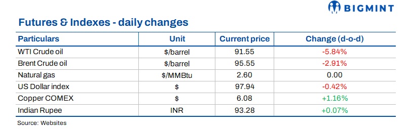 Brent crude traded near $95/bbl, while WTI hovered around $91/bbl, as markets factored in potential resumption of flows from the Middle East.