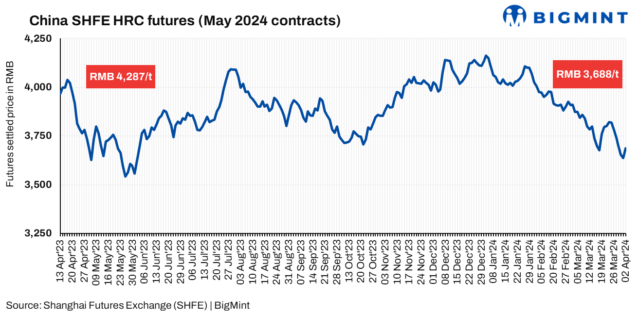 Chinese SHFE HRC futures fall w-o-w: The Shanghai Futures Exchange (SHFE) witnessed decline in prices due to subdued domestic demand and declining prices of raw materials. SHFE HRC futures fell by RMB 94 ($13/t) w-o-w to RMB 3,688 ($510/t) against RMB 3,782 ($523/t). However, on d-o-d basis the same increased by RMB 50 ($7/t) as compared to RMB 3,638 ($503/t) on 1 April 2024.