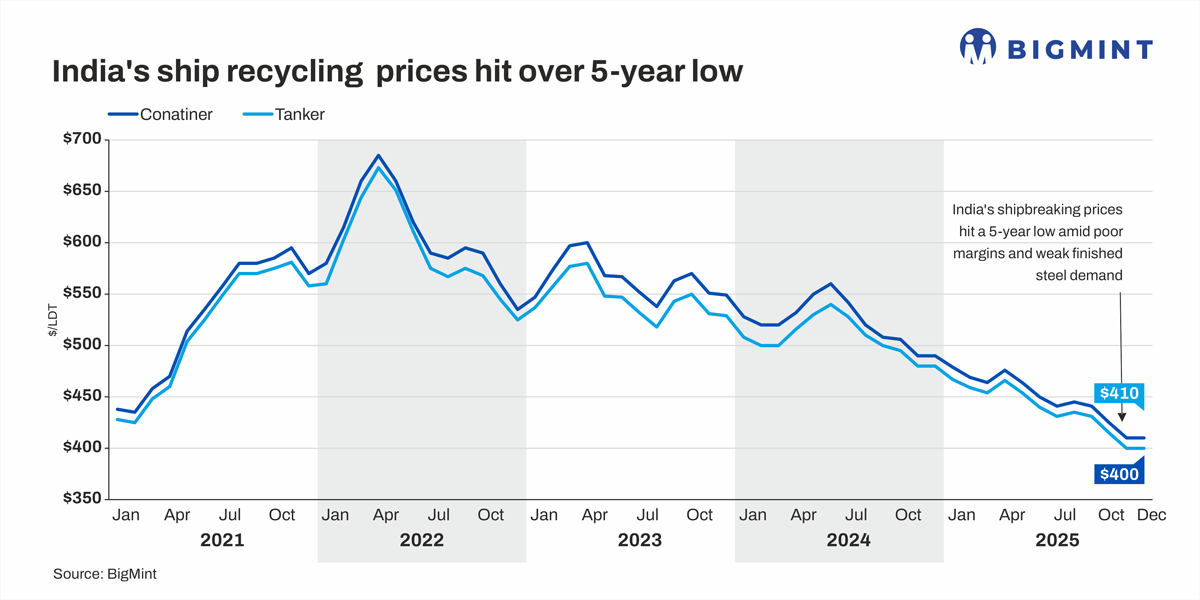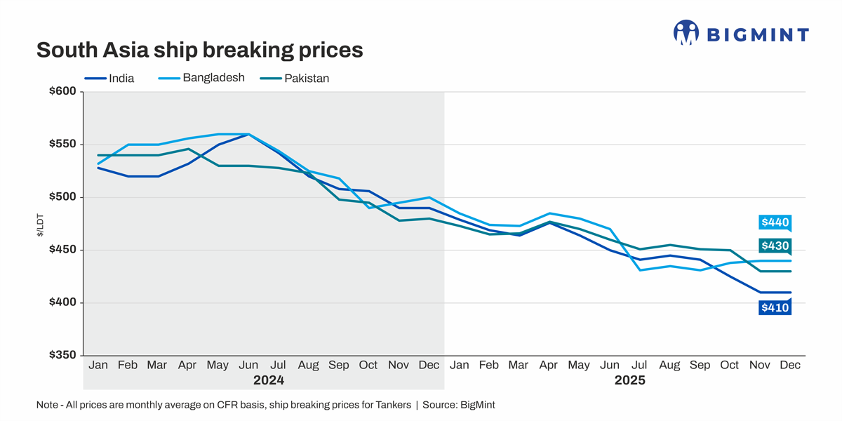Tanker prices showed similar declines, with India averaging $438/LDT, while Bangladesh and Pakistan settled at $447/LDT against $516/LDT and $506/LDT a year earlier. Weaker domestic steel demand and fluctuating freight markets reduced recyclers' ability to bid aggressively.
