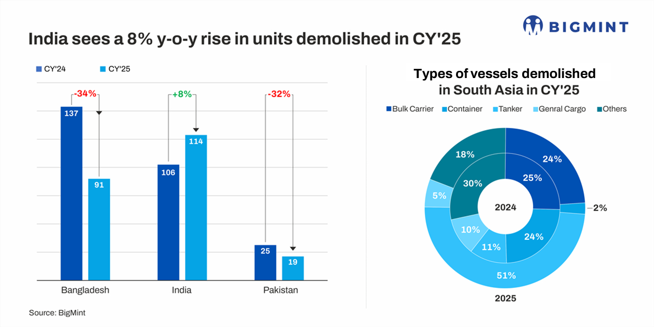 Morning Brief: South Asia's ship-breaking market expanded in 2025, with total demolition activity rising 25% y-o-y to 2.25 million light displacement tonnage (mn LDT) from 1.8 million LDT in 2024, according to BigMint data.