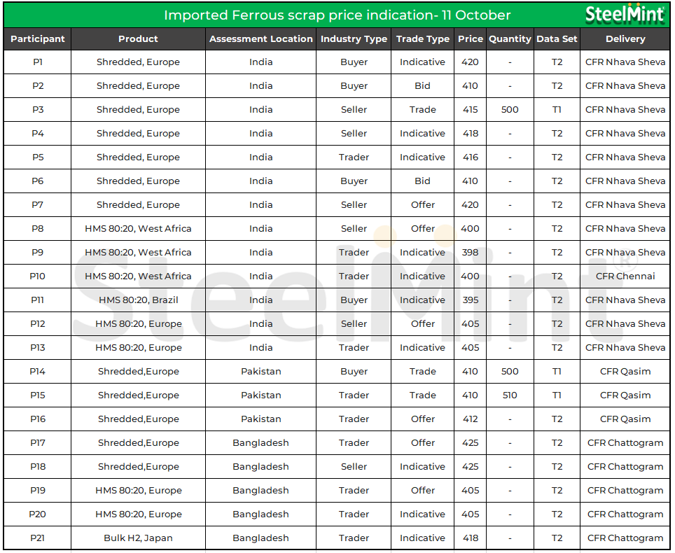 Offers for shredded scraps arriving from Europe were being quoted in the range of $415-$420/tonne (t) CFR Nhava Sheva. However, potential buyers set their sights on a lower price point, aiming for $410/t CFR levels.