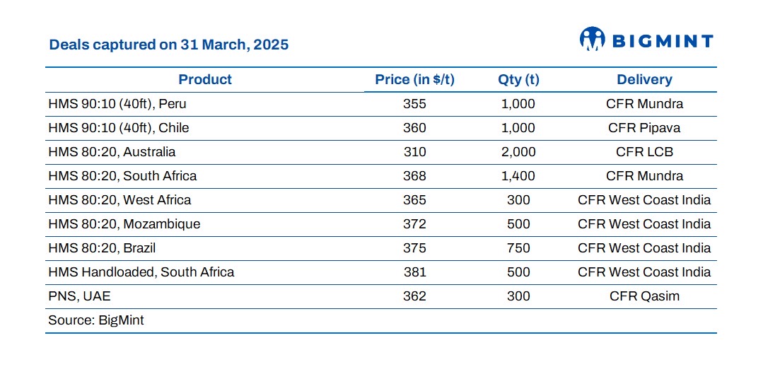 India: India's imported scrap market slowed down, as the financial year-end and regional festivities such as Eid and Navratri kept buyers cautious. While some optimism in northern and western regions led to some bookings, overall activity slowed due to persistent bid-offer mismatches. Shredded offers stood at $390-395/t CFR, but buyer resistance above $385-388/t limited transactions. HMS 80:20 from the UK/Europe and West Africa was quoted at $360-370/t CFR, though buyers aimed for $355-365/t, further constraining trade.