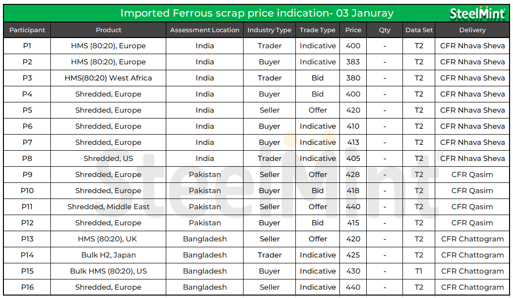 Indicative offers for shredded scraps from Europe were at around $410-415/t CFR Nhava Sheva, while HMS (80:20) was quoted at $380-390/t CFR.