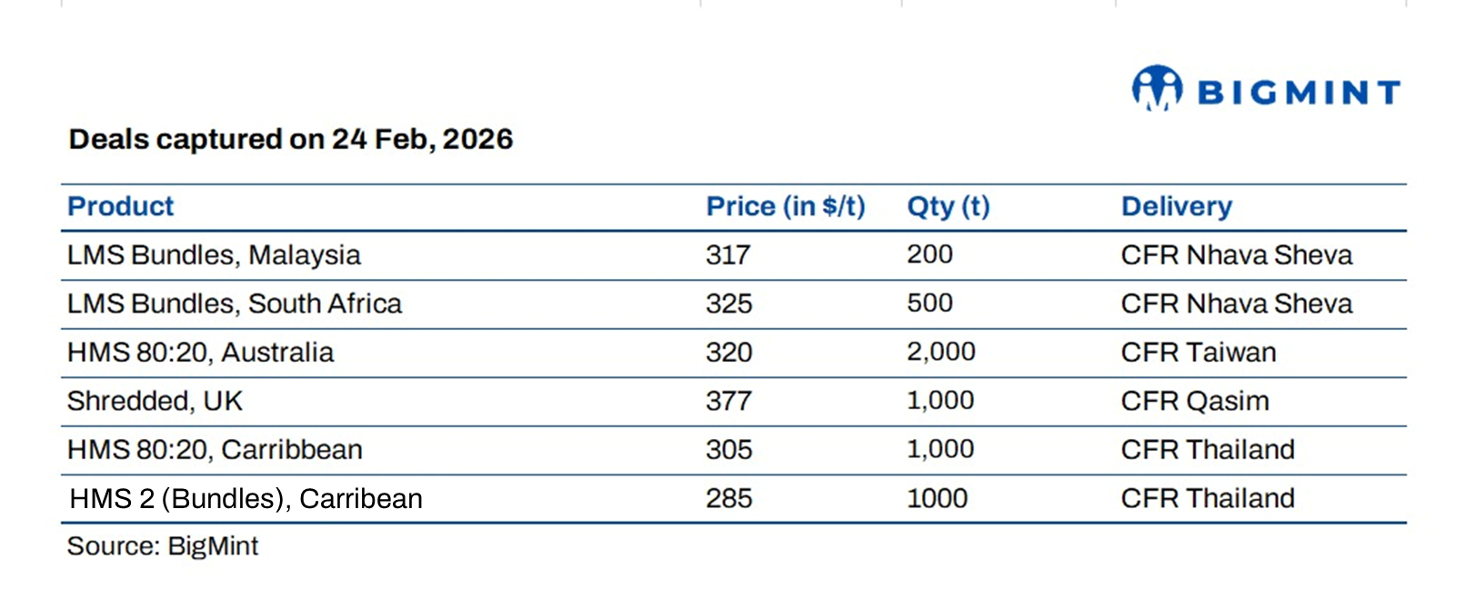 Bangladesh: Imported scrap sentiment strengthened post-election, with Australia-origin HMS 80:20 heard at $360/t and above and shredded at $380-382/t CFR, though buyer bids remained lower at $372-375/t. Fresh Australia-to-Bangladesh offers were reported at $355-360/t for HMS 80:20, $365-370/t for HMS 1, $375-380/t for shredded, and $380-385/t for PNS, reflecting firm seller expectations amid cautious buying.