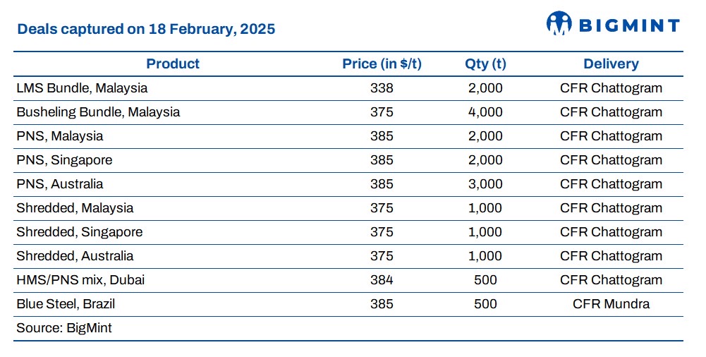 Market participants reported PNS scrap offers from Hong Kong at $385-390/t CFR Chattogram, while materials from Singapore and Malaysia were priced at around $390/t CFR. Meanwhile, HMS 80:20 from Brazil was heard at $365/t CFR, reflecting cautious buying sentiment.