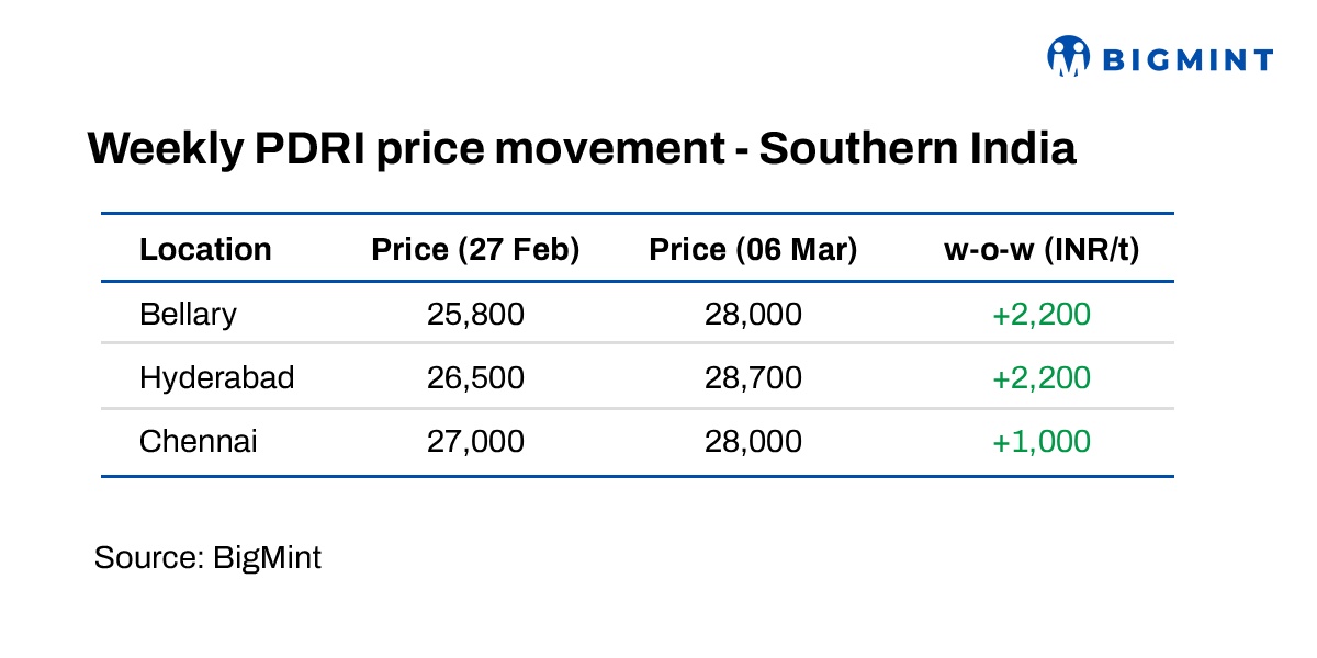 Steel prices in South India increased sharply w-o-w on 6 March 2026, by around INR 2,000/t, driven by a surge in basic raw material costs such as sponge iron and coal. Despite moderate trade activity, higher production costs of steel manufacturers supported the price rise and helped maintain a firm market sentiment across the region.