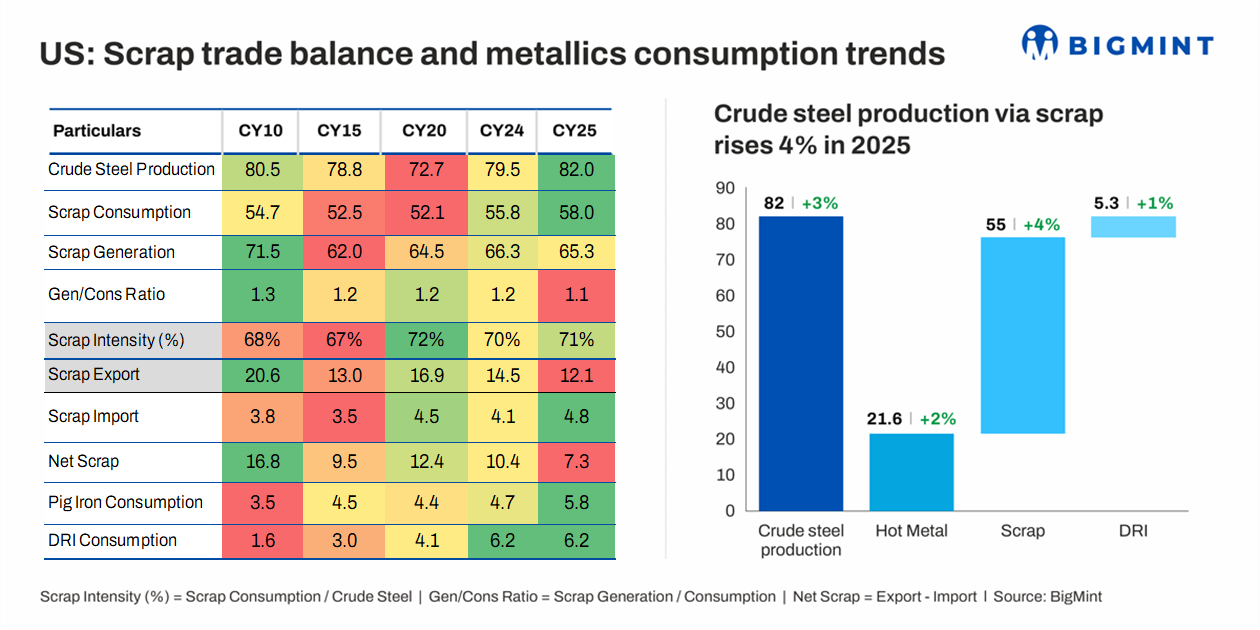 US crude steel production rose by 3% y-o-y to 82 mnt in 2025, compared to 79.5 mnt in 2024. Firm steel prices also supported mill margins, allowing producers to outbid overseas buyers and retain scrap within the domestic market.