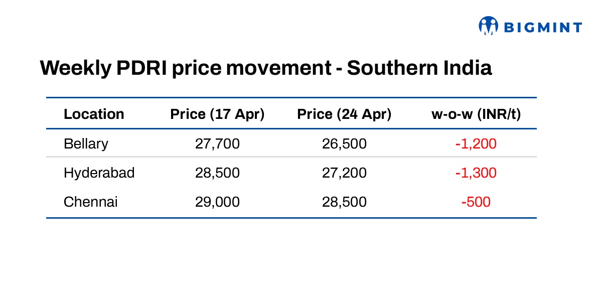 Sponge iron prices in the Bellary region declined sharply by around 5% (INR 1,200/t) to approximately INR 26,500/t w-o-w as of 24 April 2026. The primary reason for this correction is weak demand from the finished steel segment, as buyers had already booked sufficient quantities in previous months.