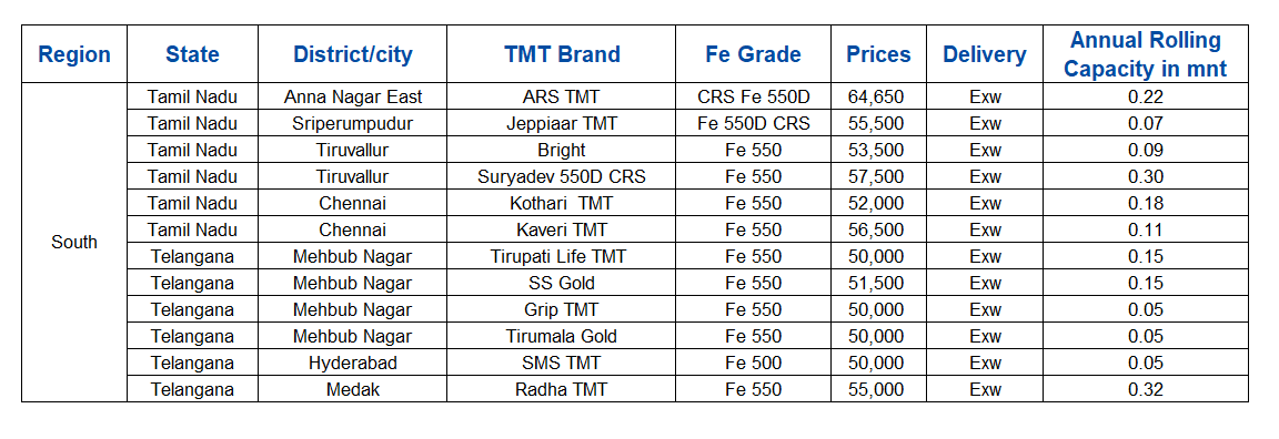 Steel prices in southern India declined by around INR 500-1,000/t w-o-w, primarily due to weak demand in the finished steel segment. Subdued buying activity across key markets kept overall sentiment under pressure.