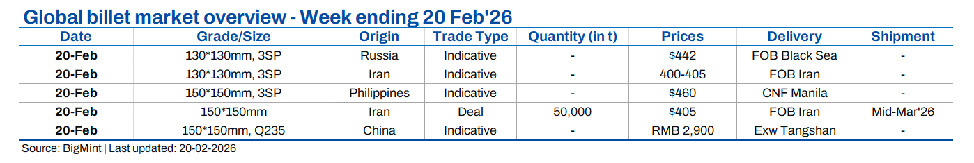 Major billet markets remained largely stable in the week ended 20 February 2026, with trading activity slowing across Asia, the Black Sea, and the Middle East due to the Lunar New Year holidays, Ramadan-related demand softness, and cautious re-roller procurement. Meanwhile, Iran continued export sales even as geopolitical tensions escalated.