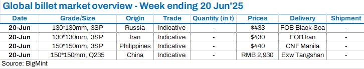 - Iran billet market hit amid war concerns: BigMint's assessment for FOB Iran prices remained stable at $430/t w-o-w. However, production is affected leading to market instability due to regional war escalations, and heightened cautiousness among participants.