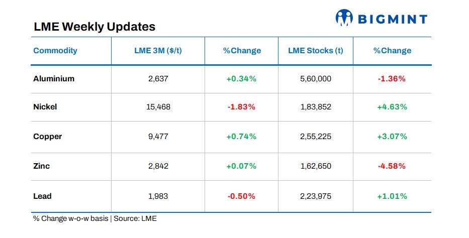 At close of trading on 14 Friday, 2025, base metals prices on the London Metal Exchange (LME) showed mixed trends, with nickel witnessing the highest decline of 1.83% w-o-w. Meanwhile, LME warehouse stocks also exhibited mixed trends, with nickel again showing a drop of 4.63% w-o-w.