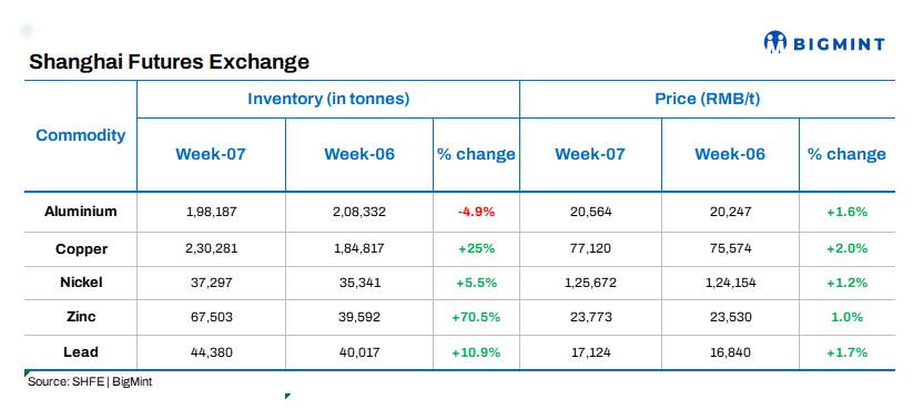 In the week ending 14 February, deliverable base metals inventories at warehouses registered with the Shanghai Futures Exchanges (SHFE) displayed a positive picture, with zinc showing the largest inflow of 70% w-o-w to 67,503 t, according to the exchange's weekly stock report.
