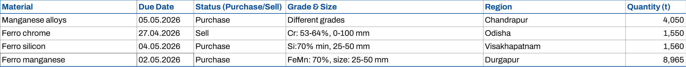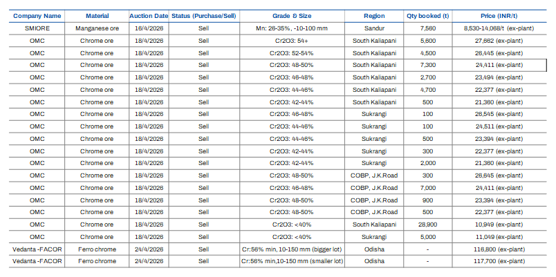 Moreover, Odisha Mining Corporation (OMC) has scheduled an auction on 27 April 2026 for 1,550 t of high-carbon ferro chrome across multiple grades and sizes (Cr: 53-64%, 0-100 mm). The base price for the 500-t lot (Cr: 60-64%, 10-100 mm) has been set at INR 117,500/t ($1,246/t) exw. Delivery of the material is scheduled within 30 days from the date of the contract.