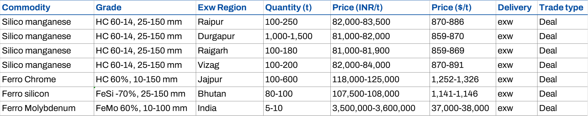 Indias ferro alloys market showed mixed trends in the week ended 25 April 2026, with prices largely moving in line with weak steel demand and cautious buying activity. Silico manganese and ferro manganese prices declined amid ample supply and limited offtake, while ferro chrome and ferro silicon remained broadly stable due to restricted participation and controlled supply.