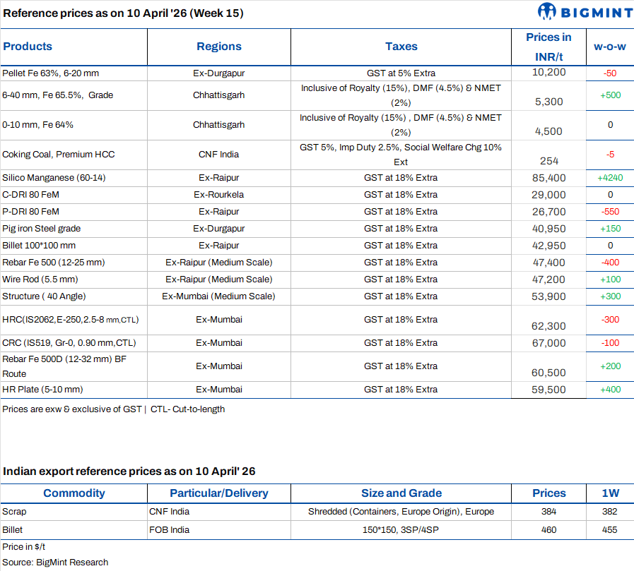 - BF-rebar: Trade-level BF-rebar prices (distributor to dealer) edged down by INR 100/t ($1/t) w-o-w to INR 60,500/t ($651/t) exy-Mumbai, as per BigMint's assessment on 10 April 2026. Buying activity remained moderate across key regions, while north India witnessed relatively subdued demand, according to sources. Distributors are holding ample inventories, leading to cautious procurement at elevated price levels. Overall, market sentiment remained mixed during the week.